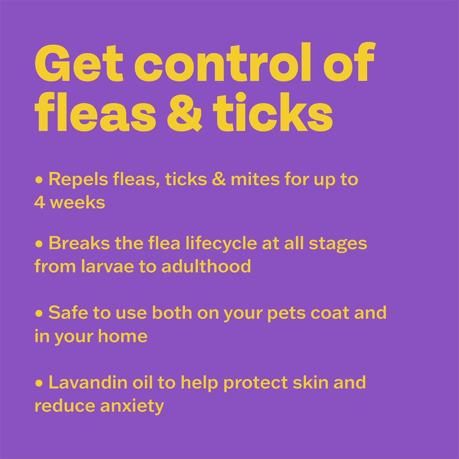 - CONTROLS FLEAS & TICKS – This pesticide-free spray works by repelling fleas and ticks, breaking the flea life cycle at all stages from larvae to eggs to adulthood